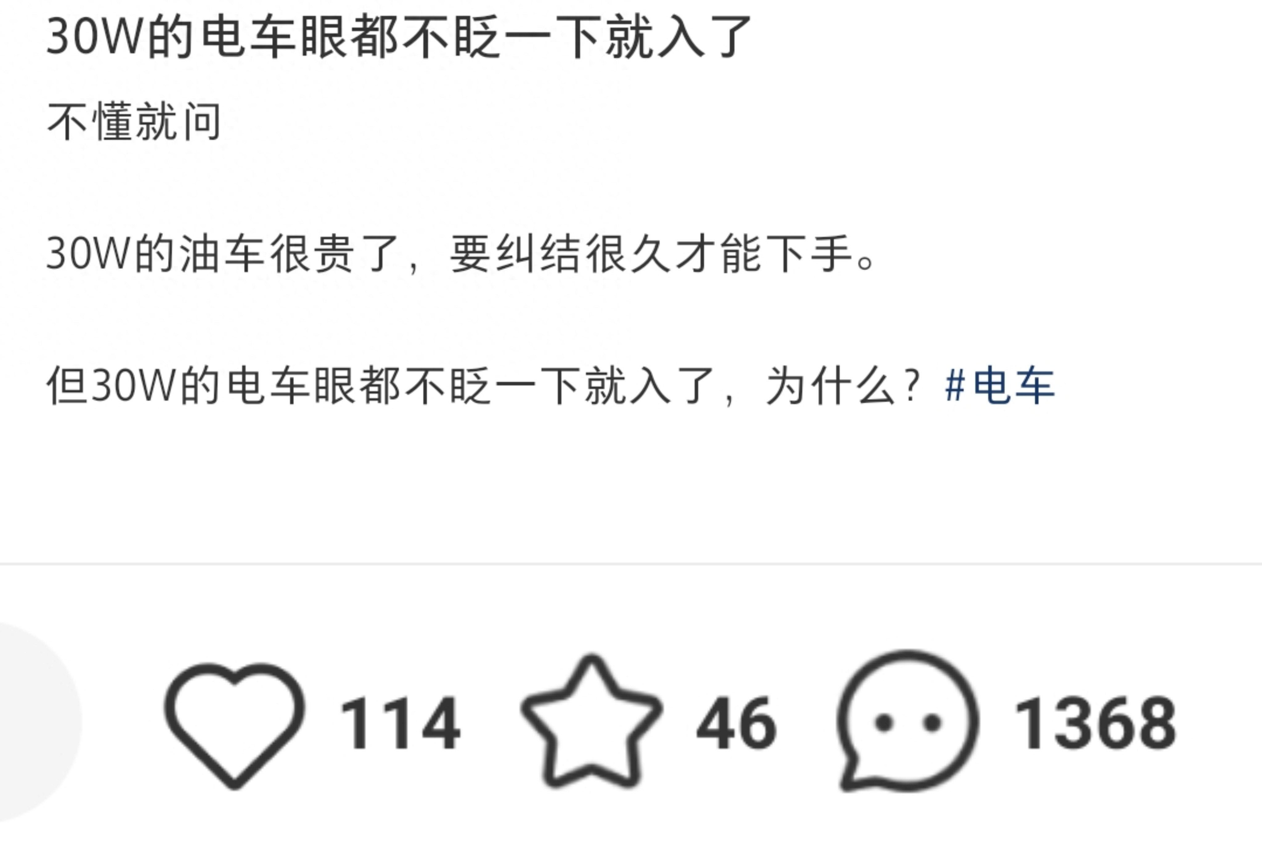 以下是话题内容:他发现一个比较有趣的事,同样是手握30万买车,如果是选择油车的话,那不少人都会思来想去纠结很久,甚至半年一年时间都有,而相比较很多买电车的朋友,整体的考虑周期就短,可以说几天时间就会拿好主意,这究竟是为啥呢?这个问题确实挺值得大家去考虑!